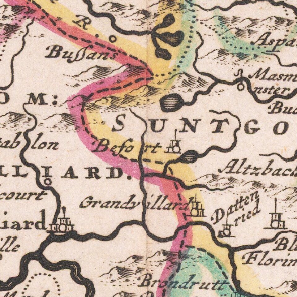 After the first 26-sheet atlas, the Danckerts released a 37-sheet (1692-4), a 50-sheet (1694-6), and a 60-sheet (1698-1700) atlas. Several of the maps added to the atlases in the 1690s reflect the theater of the Great Alliance War (1688-1697). Other political events also influenced the contents of the atlases. For example, the English and Irish sheet maps were altered in 1688-9 and 1689-91 respectively, just after the Glorious Revolution of 1688.