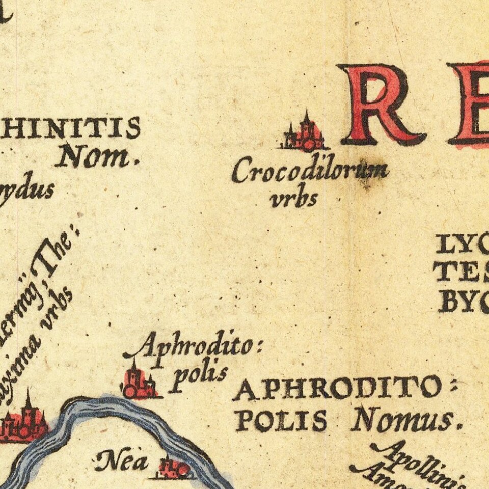 These cities are interesting examples of the profound influence that Greek and Roman cultures had in Egypt. Thonis-Heracleion (Heraclium) was a center of trade and clearly frequented enough by Greeks to have its own Greek name. Alexandria’s library was visited by Greek and Roman scholars alike, and Egypt was ruled for 300 years by the Ptolemies, descendants of a general of Alexander the Great. This map, with its many Greek and Roman place names, is a powerful example of how Egypt was influenced by its Mediterranean neighbors.