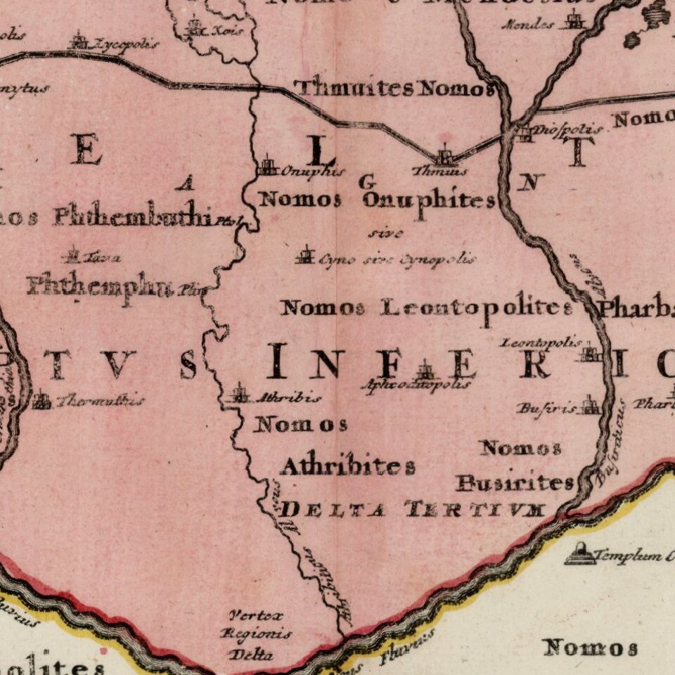 Provides a large format look at the Nile Delta, extending south the area near Memphis, Goshen, Nilopolis and Heracleopolis.