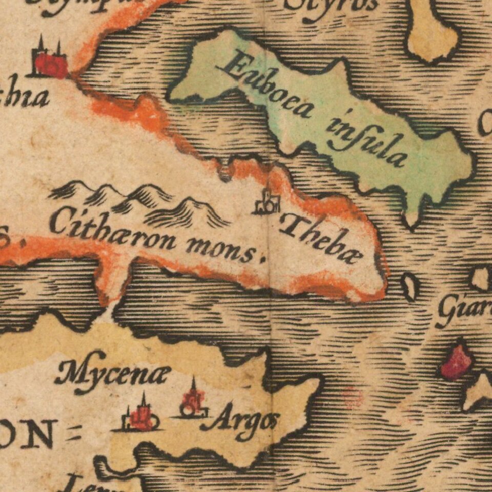 Numerous mythological places can be found on the map. Mount Olympus is located on the eastern coast of Greece (Macedonia), as are the cities of Thebes (Thebae) and Phythia, home of the hero Achilles. The home of the Cyclopes as well as Scylla and Charybdis (Charydis), all monsters that Odysseus faced in the Odyssey, are located on Sicily and southern Italy, while the island of Ithaca, Odysseus’s home, is on the west coast of Greece.