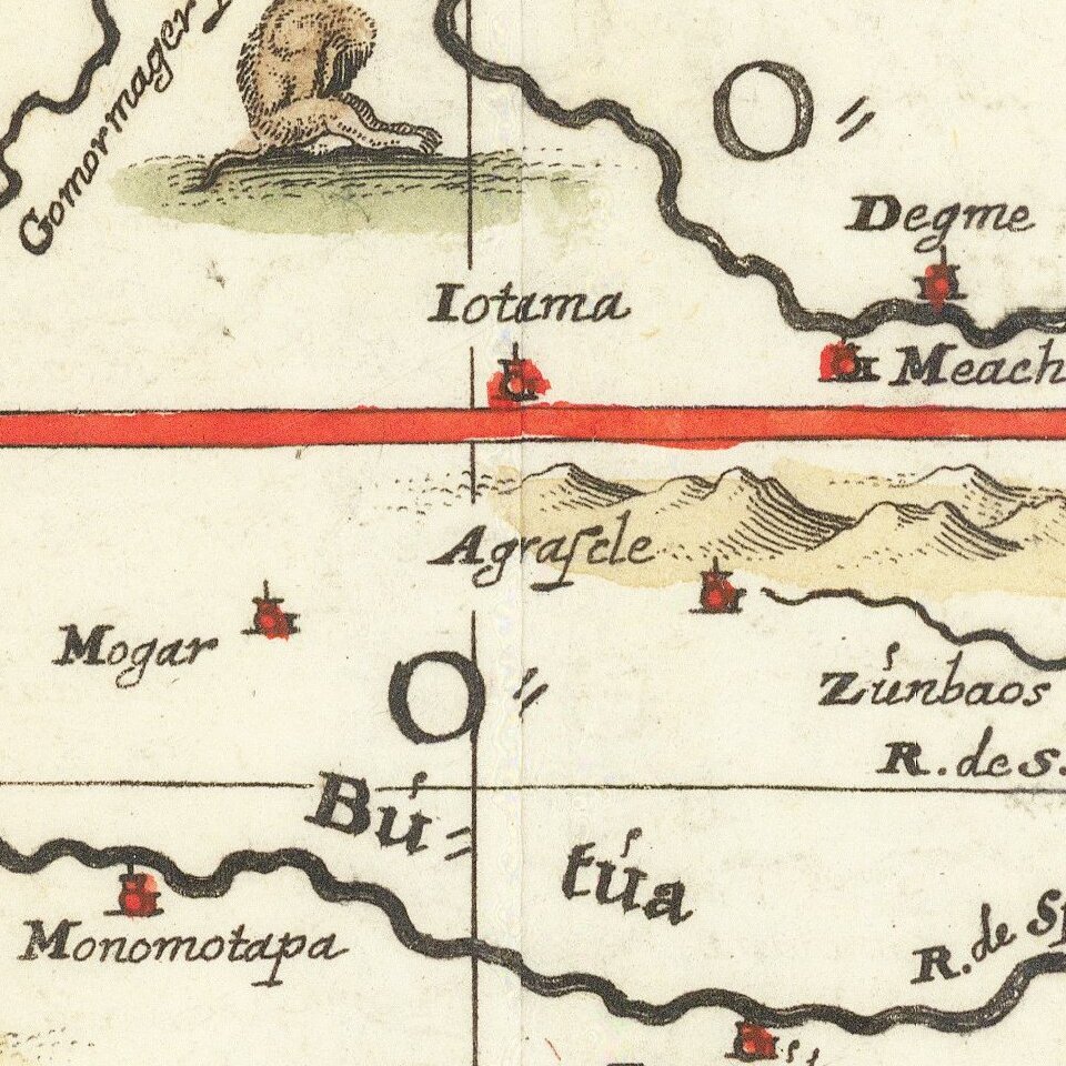 The area shown is from the Congo River basin around the Cape of Good Hope and up the east coast as far as northern present-day Mozambique. Many coastal names shown, including Mozambique Island which was an important stop over for ships sailing to India and points east. To the north, one of the Ptolemaic lakes thought to be the source of the Nile is shown. Information on the interior is sparse, reflecting the lack of knowledge the Europeans had about the interior of Africa.