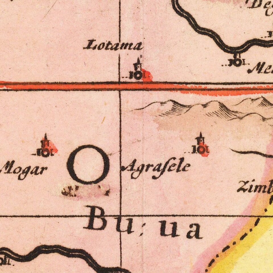 The area shown is from the Congo River basin around the Cape of Good Hope and up the east coast as far as northern present-day Mozambique. Many coastal names are shown, including Mozambique Island which was an important stopover for ships sailing to India and points east. To the north, one of the Ptolemaic lakes thought to be the source of the Nile is shown. Information on the interior is sparse, reflecting the lack of knowledge the Europeans had about the interior of Africa.