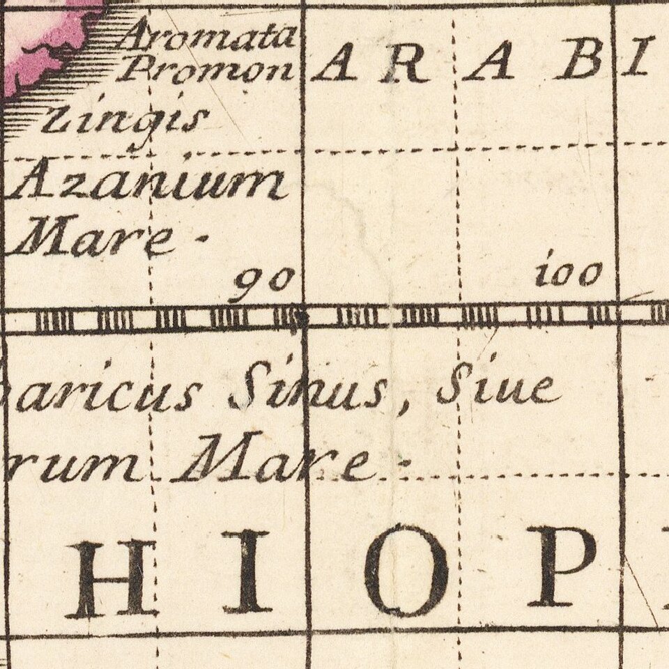 Coronelli bases his map on classical geography, as known at the time of Ptolemy, Strabo and Mela, covering most of Africa and the Indian Ocean, but no Japan or China or NE Cooast of Asia.