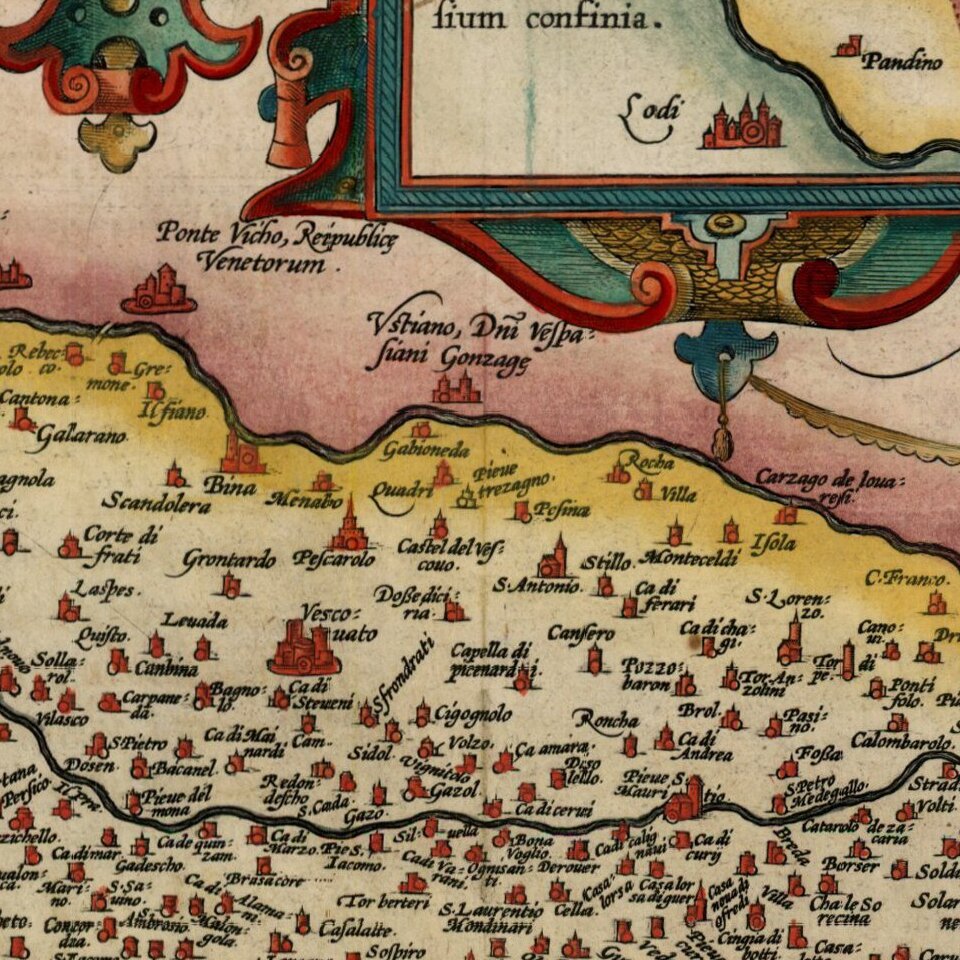 Extends to Mantua and Piacenza. Several ornate cartouches. Van Den Broecke notes "Antonio Campi (1536-1591 or later) received a privilege for his map of the surroundings of Cremona in 1571. Ortelius' map is based on a manuscript version of this map, which was published in 1583. The inset of Crema goes back to an unidentified source, published by Forlani in 1570."