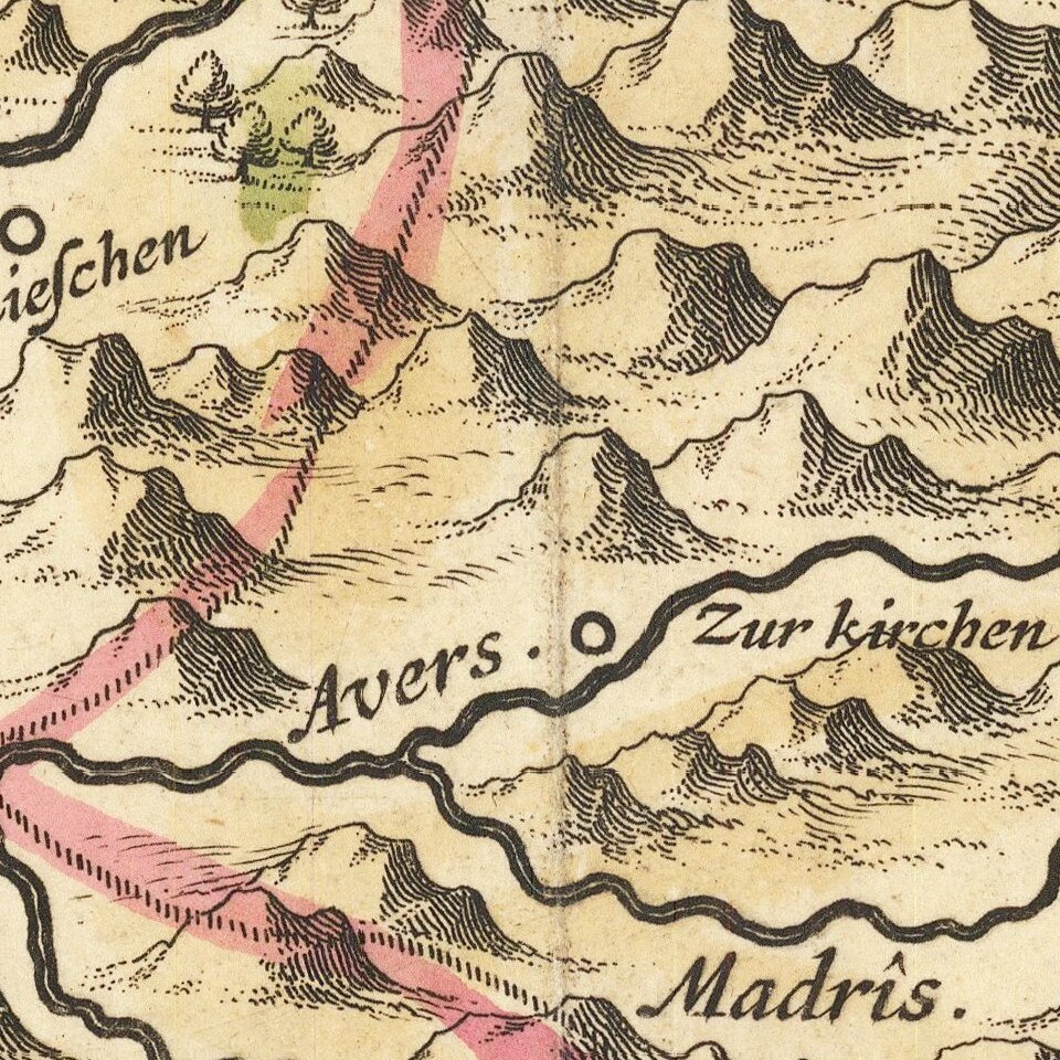 The map shows the towns and cities of the mountainous region, including Davos and St. Moritz.