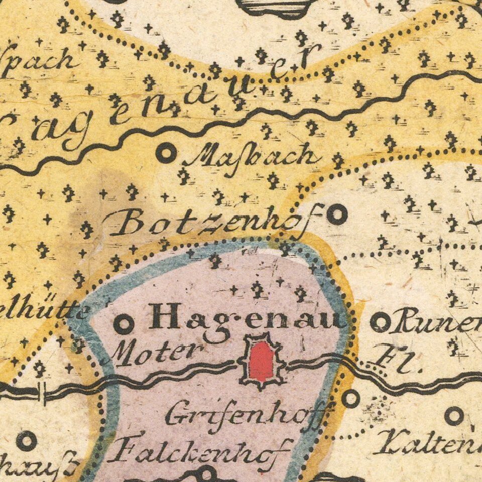 Highly detailed map of the Alsace region, tracking the course of the Rhein from the Strassbourg area to just east of Landau.