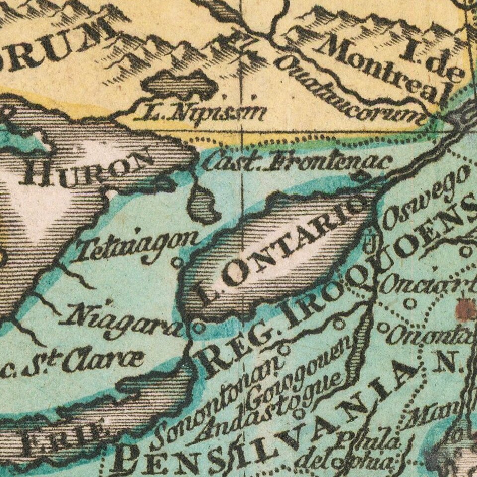 The Great Lakes, based on Coronelli, show the French strongholds at Tadousac, Quebec, Fort Sorel, Montreal, and Fort Frontenac. The English settlements are kept to the east of the Alleghenies, with Fort and River Kinibeki as the border between New England and Acadia.