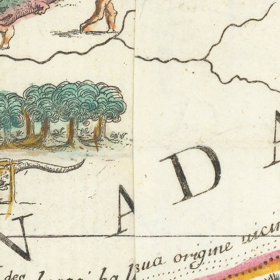 Several scenes are drawn into the geography of the continent itself, most depicting indigenous peoples acting as Europeans imagined they did—most likely a far cry from the realities of quotidian indigenous life and culture. For example, some naked men and women roast a human near Hudson’s Bay, while a massive alligator is munching people in what is today Louisiana. More informative are the sketches of indigenous people drying fish and burning wood.