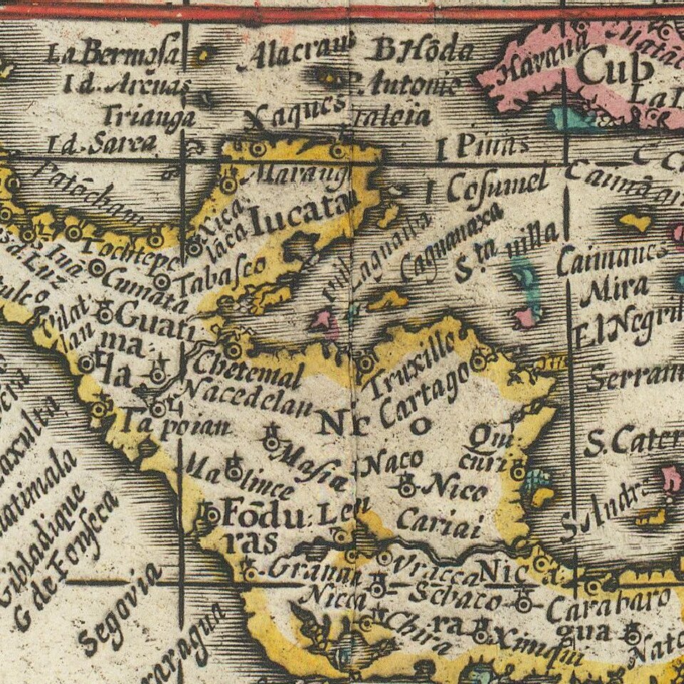 Blaeu's map of America is one of the most sought after maps of America from the Golden Age of Dutch Cartography, blending contemporary geographical knowledge and a rich decorative image. Blaeu's maps set the standard for the quality of the engraving, paper and color, as well as a fine depiction of contemporary geographical knowledge.
