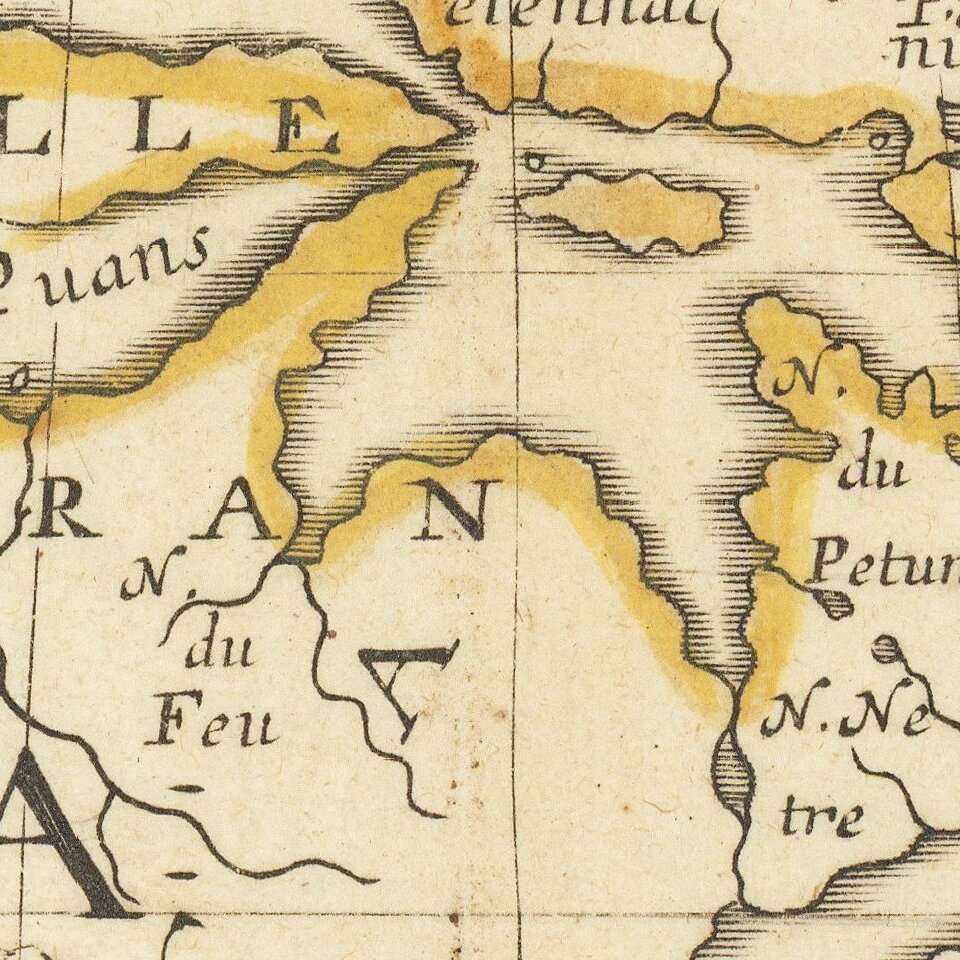 In the Southwest, Sanson draws up the reports of the travels in New Mexico of Father Alonso Benavides Memorial, published in Madrid in 1630. It is the first printed map to label "S[anta] Fe" (incorrectly shown the Rio Grande) and the "Apache," "Navajo" and the "Taosij" (Taos) Indian regions. California is shown as a large island, based largely on Johannes de Laet's map of 1630. The region in the north called "Conibas" represents a mythical land between North America and Asia.