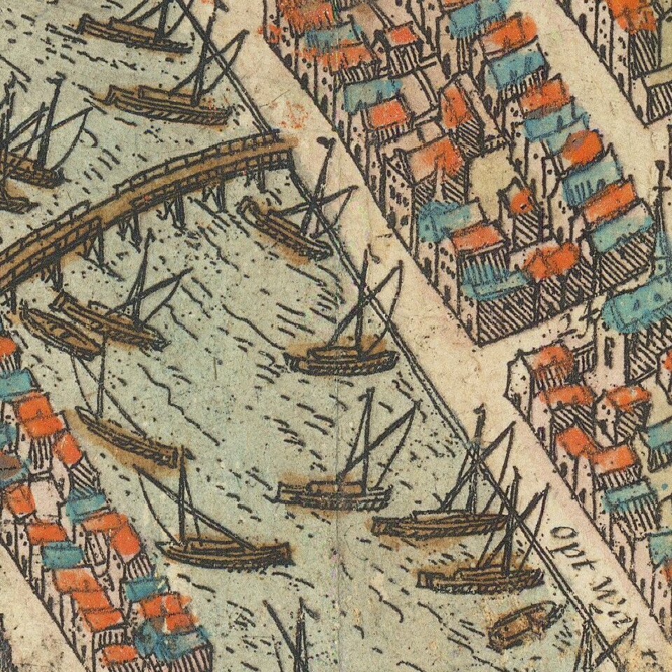 Cornelis Anthoniszoon (1505 to 1553) was a grandchild of Jacob Cornelisz van Oostsanen, who probably taught him to paint, and a cousin of Dirck Jacobsz. In 1538, Anthoinszoon painted the first complete map of Amsterdam as a commission from the city fathers to present as a gift to Charles V. Anthoniszoon. He is best known for his woodcuts, especially his view of Amsterdam, from 1544. This was printed in 12 blocks of wood and was re-issued until well into the 17th century.