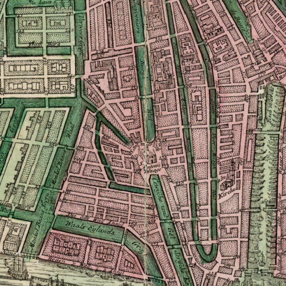 Nice full color example of Seutter's decorative and highly detailed plan of Amsterdam, with a striking view of the City and allegorical embellishments below.