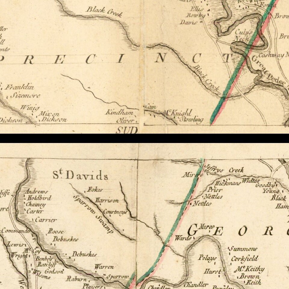 For North Carolina, Mouzon inserted for the first time Tryon County and Pelham County (later called Sampson). The topography west of the Catawba River is more detailed and accurate than on any previous map. Mouzon also advanced beyond earlier maps in his inclusion of rivers, streams, roads, and physical features like White Oak or Tryon Mountains and Kings Mountain.