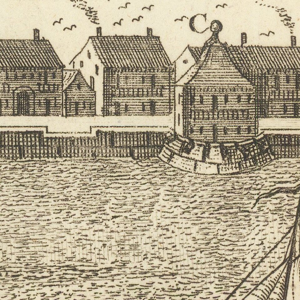 There are two examples of the view. The second edition (re-engraved in 1779) can be readily distinguished by the lack of the small sailing craft to the left of the flagged large sailing ship on the left side of first edition, just below the letter A.