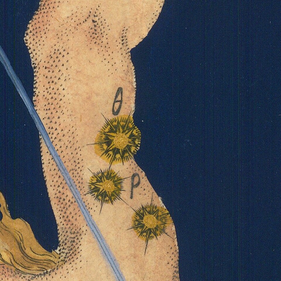 Decorative map of the Constellation Andromeda, with the stars heightened in Gold. The plate was originally included in the forty-eight maps of the individual constellations in Bayer's Uranometria in 1603. This is from the first reissue, without text on verso. The stars are identified by letters, Greek for the brightest, Roman for the fainter, with the order of the alphabets corresponding to decreasing brightness of the stars. Although a similar scheme had been introduced by Piccolomini (1540), it was Bayer's scheme that became universally accepted. Bayer based his constellation figures on the work of Jacobo de Gheyn and included stars from Ptolemy as well as the recent observations of Tycho Brahe and Keyser. The atlas was also the first to represent the stars of the southern latitudes and based on observations which can be traced to an actual voyage of discovery-that of Houtman's first voyage to the East Indies in 1595-97. According to Elly Dekker, the Uranometria substantially influenced Schiller's Coelum Stellatum and Kepler's Tabulae Rudolphinae. The work contains 49 charts of constellations, many expressed as familiar mythological figures, and two charts of the northern and southern hemispheres. Bayer estimated the magnitude of each star, from first to sixth magnitude and initiated the method of distinguishing the stars in each constellation by Greek letters-a practice still in use by astronomers today. Art historians acclaim Bayer's work for the beauty of figure design and the quality of the engraving. Historians of science are still bringing to light its influence on later developments in celestial cartography. Publication of the Uranometria virtually shaped the way the heavens would be perceived for more than two centuries.