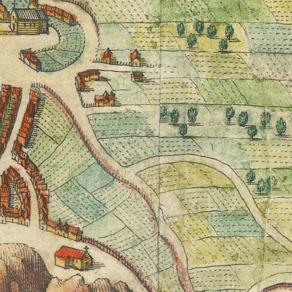 Mathaus Merian (1593-1650) was the father of engraver Matthäus the Younger, and of the painter, engraver, and naturalist Maria Sibylla Merian. He was born in Basel, Switzerland and trained in engraving in Zurich. After a time in Nancy, Paris and Strasbourg, he settled in Frankfurt. While there, he worked for Johann Theodor de Bry, the publisher and son of the travel writer. In 1617, he married Maria Magdalena de Bry, Johann Theodor’s daughter. In 1623, Merian took over the de Bry publishing house upon the death of his father-in-law. Merian’s best known works are detailed town views which, due to their accuracy and artistry, form a valuable record of European urban life in the first half of the sixteenth century