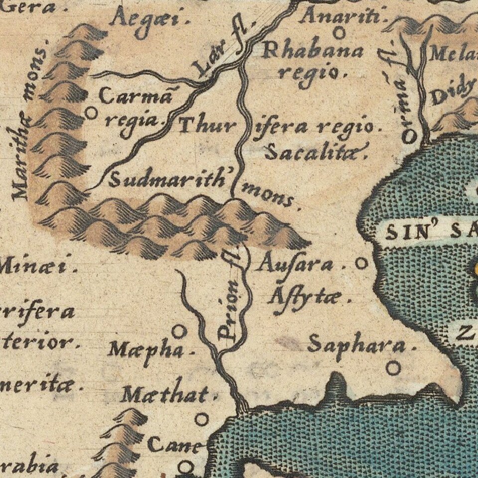 Detailed map of the Arabian Peninsula and environs, based upon the work of Ptolemy.
