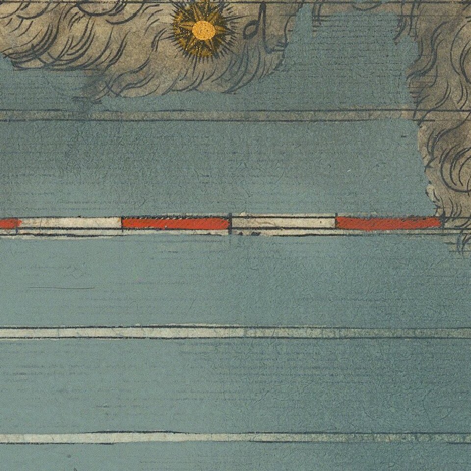 Striking full color example of Bayer's celestial chart of the constellation Aries, with the stars heightened in gold. The present example has no text on the verso.