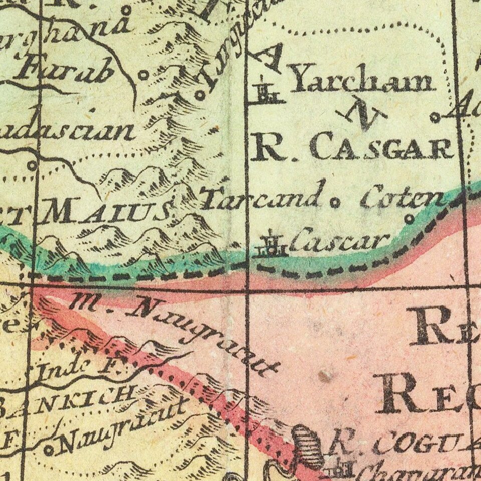 The interior is remarkably detailed, with political divisions shown with dotted lines, cities large and small are marked, as are rivers and mountains. In the upper left corner is a decorative cartouche; the ornate frame gives way to mountains and a grand parade of elegant, turbaned men on camels. Below this are a series of scales in their own frame, and in the lower left corner is a note explaining the ongoing geographical work on the part of the author.