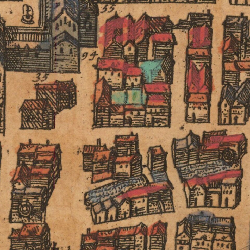 The authorities of this city dedicate themselves in particular to caring for the poor. For as well as maintaining a hospice and an orphanage, in periods when the plague or syphilis were raging they also established a hospital, the Blatterhaus, to tend to and accommodate the afflicted. Furthermore, in 1519 and at their own expense, the Fugger family built about 100 houses for needy but respectable citizens in the suburb of St James, in effect a distinct quarter, which is called the Fuggerei.The bird's-eye view of Augsburg shows the individual groups of buildings very clearly, including the Fuggerei (72, bottom left), mentioned by Braun and founded in 1514 as an enclosed housing complex for impoverished citizens. The cathedral (32, right) is a Romanesque building with Gothic elements. Directly beside the town hall (52), in the center of the city, lies the church of St Peter am Perlach (35). Its tall tower, called the Perlachturm, was remodeled in the 17th century and is a city landmark. The present town hall was begun in 1615 in the Renaissance style. The church of St Anne houses the burial chapel of the Fugger family; Martin Luther stayed at the affiliated monastery (23, above St Peter am Perlach) when he was summoned to Augsburg to defend his theses before the imperial diet in 1518. The Benedictine abbey of SS Ulrich and Afra (17), on the left-hand edge of the map, dates from the 15th century, when Augsburg was home to some 30,000 inhabitants. During this period Augsburg was a center of German economic and intellectual life and frequently played host to imperial diets.