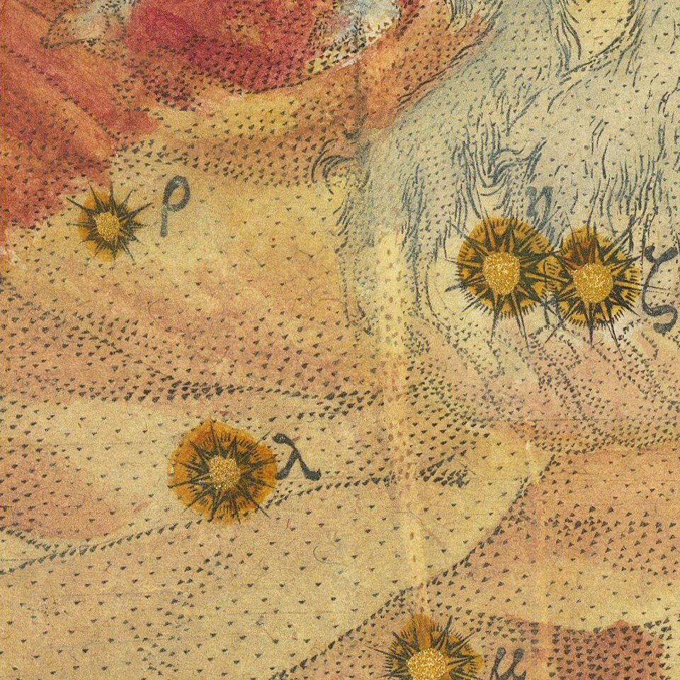 Another important feature of the atlas was the introduction of a new system of stellar nomenclature. Bayer assigned Greek letters to the brighter stars, generally in the order of magnitude, so that the bright star in the Bull's eye became alpha Tauri (and the brightest star in the Centaur became our familiar alpha Centauri.) These letters were placed on the charts themselves, and also in a table that accompanied each chart. Bayer's charts are rarely offered seperately on the market.
