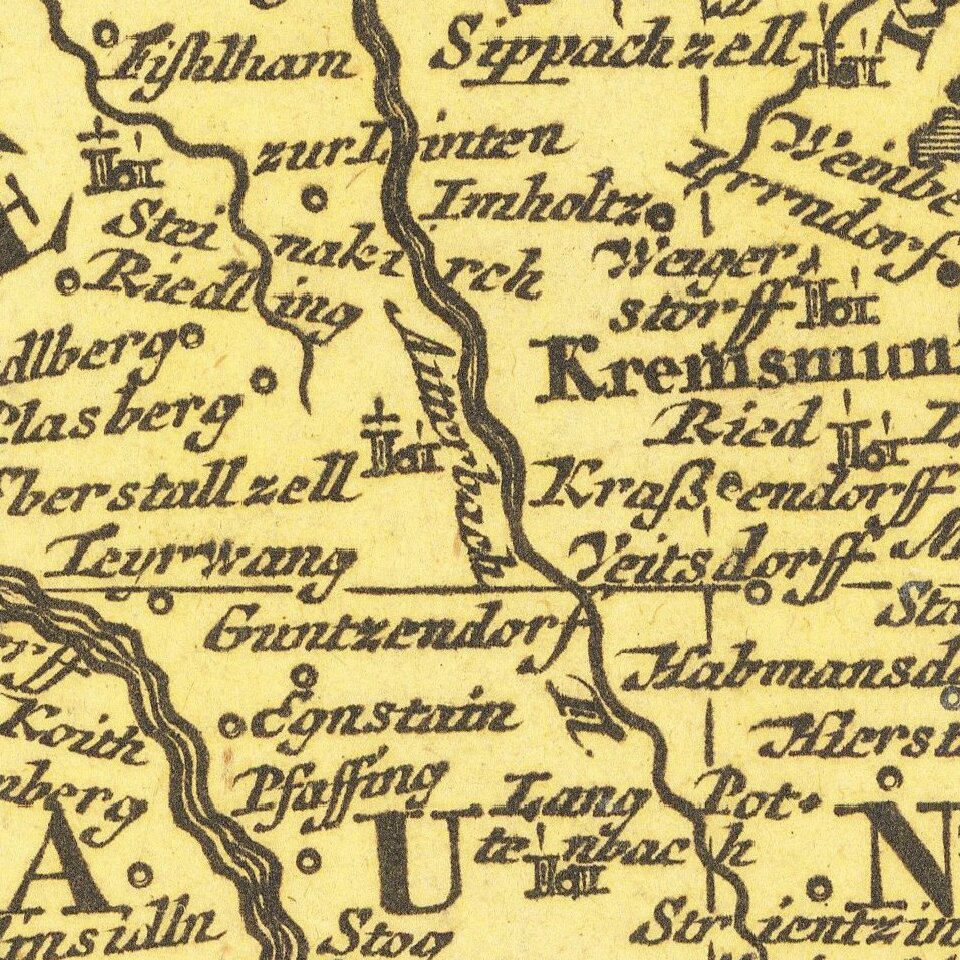 Also shows Salzburg, Rachstats, Rottenman, Loeben, Waiddhofen, Zwetl, Weitra and Passau. Ornate cartouche.