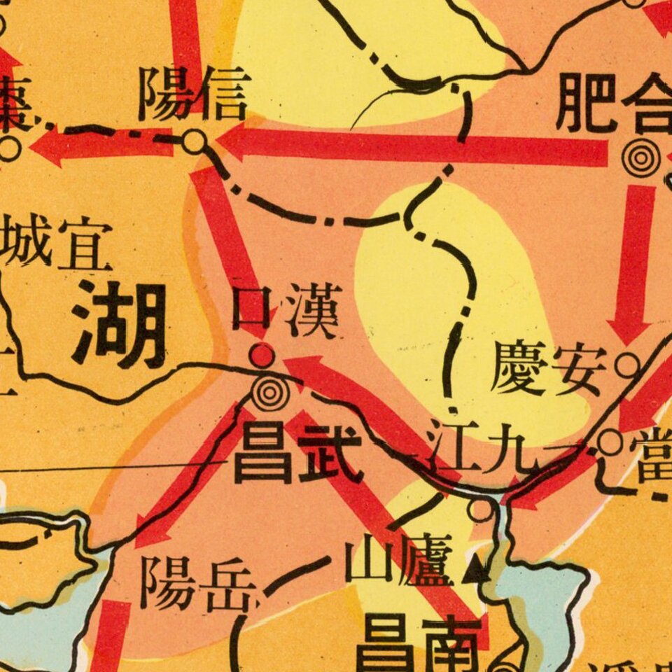 This map depicts the major military developments of the “Eight-Year War of Resistance,” commonly known in the West as the Second Sino-Japanese War. Red arrows depict the movements of Japanese forces, while black arrows depict the movements of the Chinese resistance. The phases of the war, in which the Japanese pushed westward until their ultimate retreat, are represented by the various solid colors. White boxes contain brief descriptions of important events.