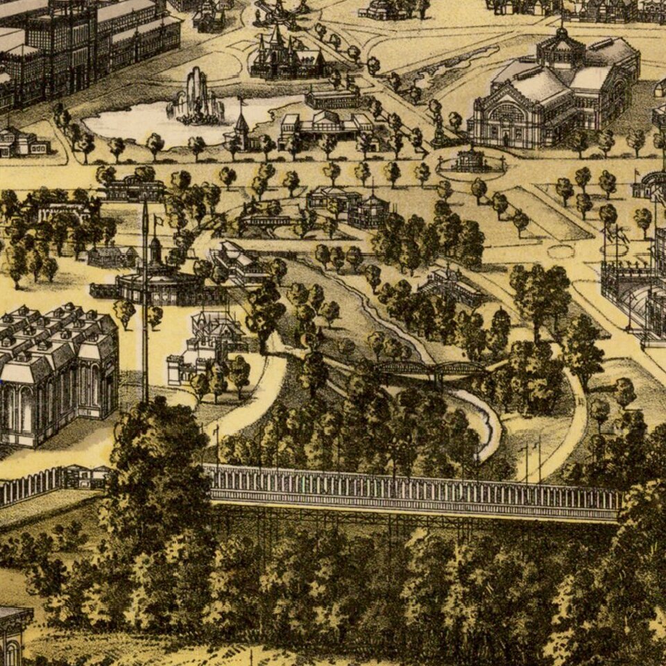 The map shows the five major buildings: the Main Exhibition Building, Memorial Hall (Art Gallery), Machinery Hall, Agricultural Hall, and Horticultural Hall. In addition to these buildings, approximately 250 smaller structures were constructed by states, countries, companies and other Centennial bureaus that focused on particular displays or services.