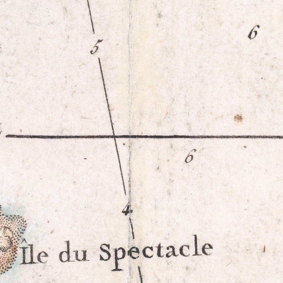 The French chart does, however, show important differences from the English version, the most obvious being the substitution of Paris for London as the prime meridian. More substantively, the long subtitle informs us that des Barres' work has been updated to reflect recent observations by Joseph Bernard, Marquis de Chabert (1724-1805), a senior naval officer who served in the Americas during the Revolution: "the declination of the magnetic needle [i.e., from true North] was observed as 6 degrees 4 minutes northeast in October 1778 by the Marquis de Chabert, who has also determined by land the latitude of several points to which this chart has been [subjected? compared?]". Chabert was an accomplished navigator, surveyor and chart maker who earlier in his career had led important surveys of Acadia and Newfoundland and it is just possible that he himself drafted this chart at Sartine's request.