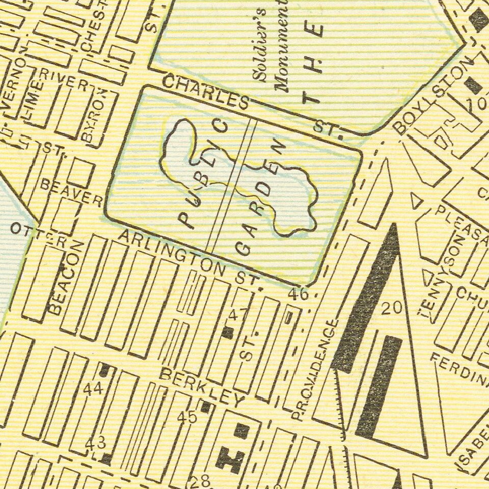 Detailed city plan of Boston, showing streets, buildings, train lines, public places, rivers etc.