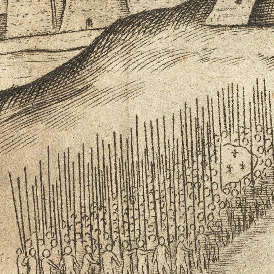 The fortified and un-fortified positions of the French and English armies are shown, with multiple groups of soldiers, both foot and mounted, can be seen throughout the image, along with encampments. Across the river is the Fortezza de Franses, which is now the town of Marquis.