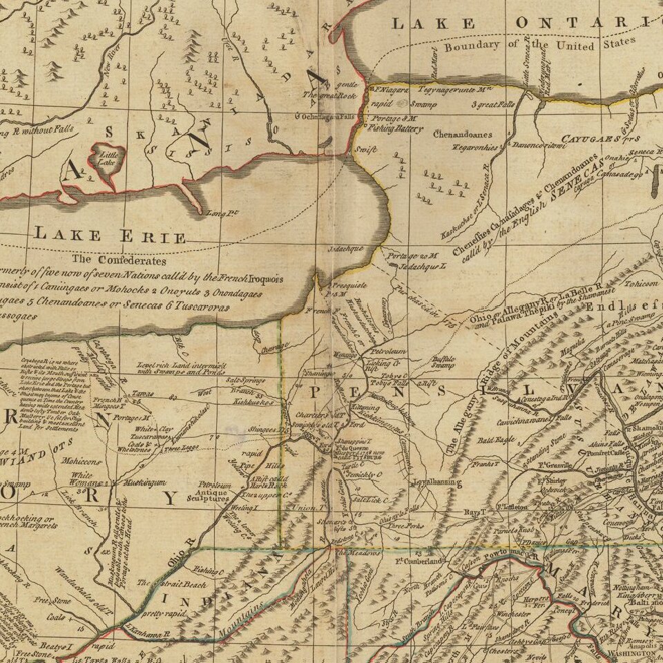 A nice example of the Bowles & Carver post-Revolutionary War edition of Lewis Evans' seminal map of the British Colonies in North America, including early references to Petroleum along the Ohio River in several places on the Upper Ohio River.