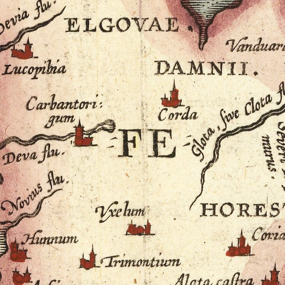 Settlements are shown with small building symbols; Londinum Augusta is located on the Tamesis flu. London Bridge, until 1729 the only bridge over the Thames near the city, is visible here. Farther north, Hadrian’s Wall separates Scotland from England.