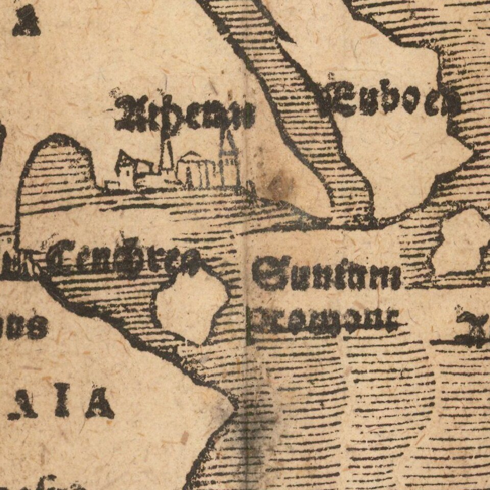A particularly notable feature of the book were its many woodcut maps, many of them showing unique depictions of geographic features and continents. In addition to the conventional maps, the book also contained three figurative maps; the world depicted using a cloverleaf design (thought to possibly represent the Trinity with Jerusalem in the center), Europe in the form of a crowned and robed woman, and Asia as the winged horse Pegasus.