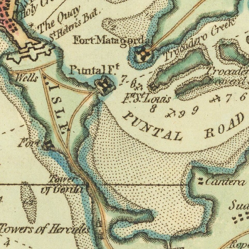 Cadiz, by the Phoenecians called 'Gadir' and by the Romans 'Gades', is situated in the province of Andalusia & its harbour the best in Old Spain. It was originally built by the Tyrians and possessed successively by the Carthaginians, Romans, and Moors, the latter were dispossessed in 1260. It is 42 miles N.W. of Gibraltar. Lat. 36.30 N. Lon. 6.40 W."