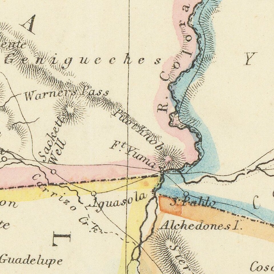 The detail in California is among the best for a foreign map, especially the unusual detail in Southern California. Pre-dates formation of Arizona, Colorado and Nevada Territories. The region recently acquired from Mexico is called Pimeria Alta. The road system in California is noteworthy as being much more detailed than most contemporary atlas maps of the region.