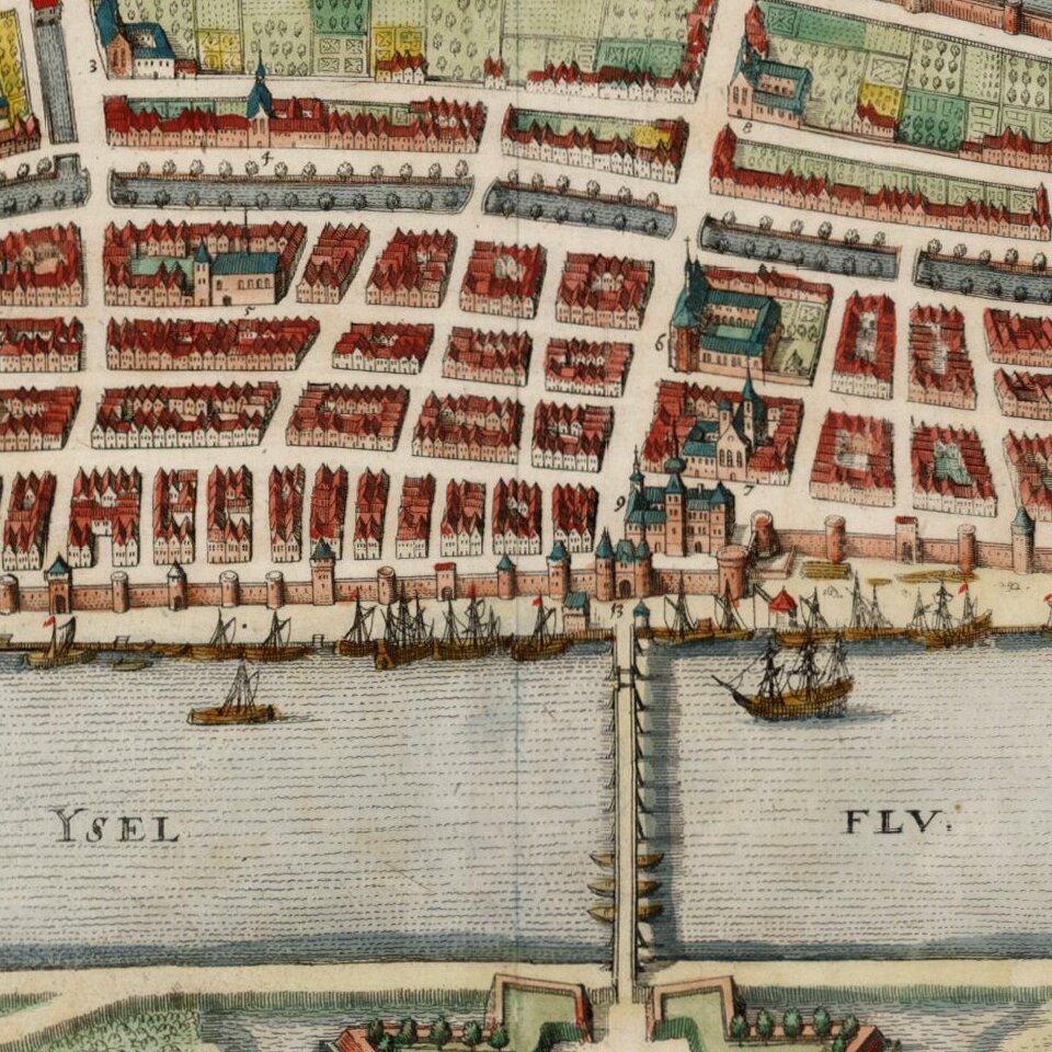 Shows town plan, fortified walls, bridge, canals, etc.