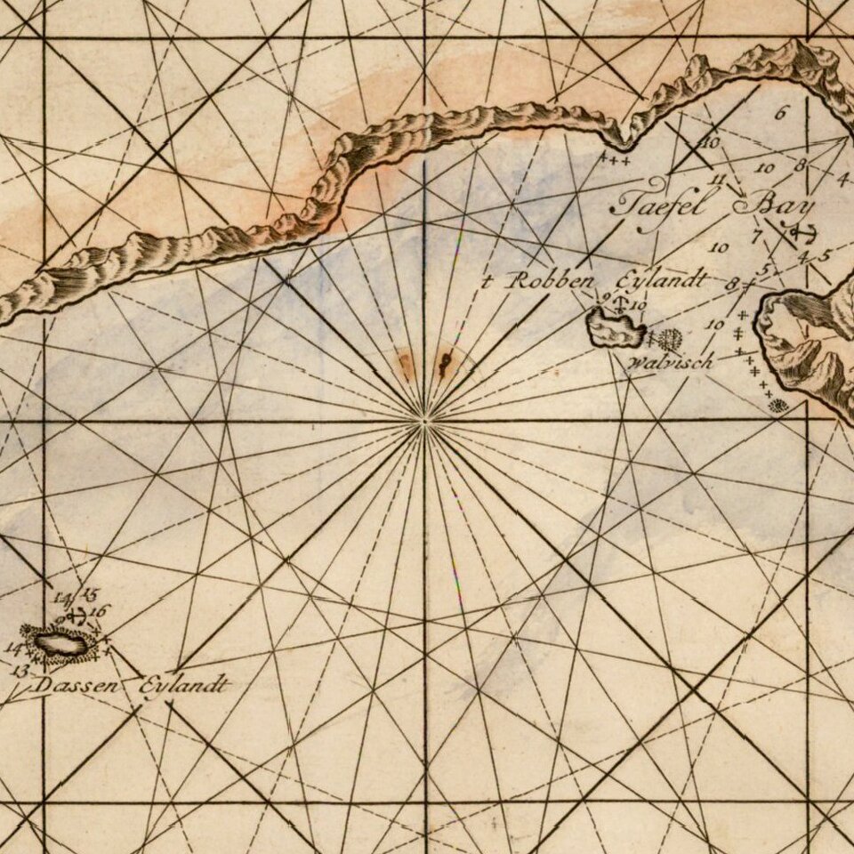 The Dutch settled the Cape in 1652 and established a camp near Table Bay. Today, this city is Cape Town, although on this chart settlements are not shown. It quickly became an important stopping point for all ships sailing from the Atlantic to the Indian Ocean.