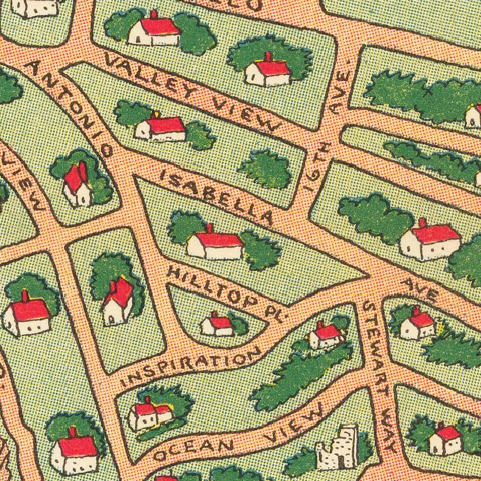 Fine example of Jo Mora's marvelous map of Carmel and the location of Mora's art studio.