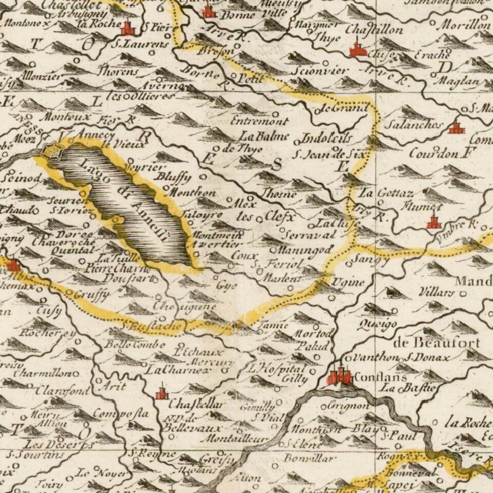 Striking map of the Duchy of Savoye, based upon De L'Ise's map.