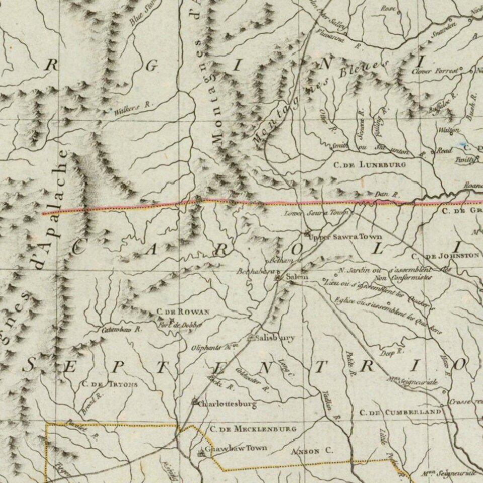 The map identifies a number of the early roads in the Carolinas and Virginia, as well as early Wetern Settlements. Of note is the inclusion of "Post Vincent" on the Wabash River, north of the Ohio River, one of the two French Settlements noted by Thomas Hutchins (the other being Ouiatenon) in the 1760s, for which Hutchins noted 60 settlers and their families. It is believed that this location may date back to a trading post founded by Sieur Juchereau, Lieutenant General of Montreal in 1702. François-Marie Bissot, Sieur de Vincennes, acting under the authority of the French colony of Louisiana, constructed a fort at this location in 1731-1732, which would become a major trading post in the region. British Lt. John Ramsey came to Vincennes in 1766. He took a census of the settlement, built up the fort, and renamed it Fort Sackville in honor of Lord George Sackville, who had led British forces to victory over the French in the Battle of Minden. After the Revolution, several dozen Kentucky families settled in Vincennes. Friction between these Americans, the French local government and the native peoples moved Virginia Governor Patrick Henry to dispatch George Rogers Clark and send troops to the region. Clark arrived at Vincennes in 1786. His attempts to negotiate with neighboring native peoples were unsuccessful. Instead, he created an incident by seizing the goods of Spanish traders, enraging the local population, and risking war with Spain. Under orders from the new United States government, Clark and his men left Vincennes in the spring of 1787. In the ensuing years, the first Fort Knox would be built in Vincennes.