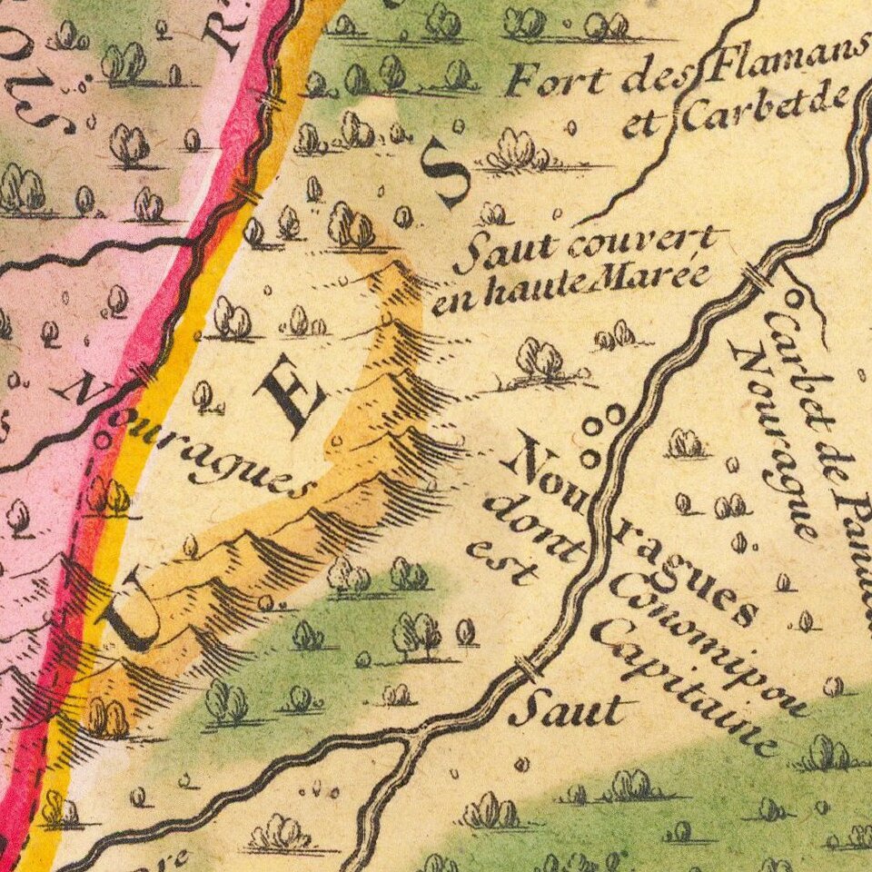D’Anville is referring to Jesuit missionaries Jean Grillet and Francois Bechamel who left from Cayenne on a harrowing journey overland to reach hitherto uncontacted indigenous groups. Having run out of supplies, they were dependent on the local people to help them return to Cayenne. Although they converted no souls and found only one possible location for a mission, they did bring back new information on the geography of the region, which was published in an account of their travels in the late seventeenth century.