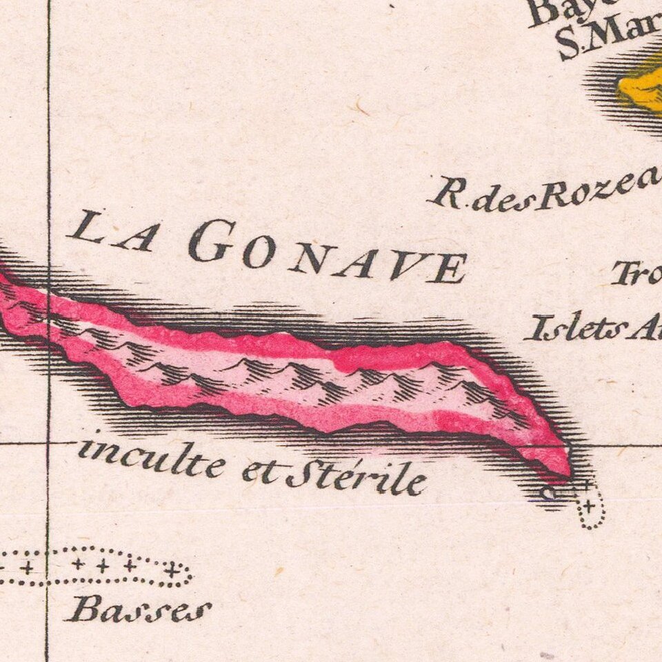 There are also many rivers marked, along with notes as to the fertility or infertility of certain areas for agriculture. For example, La Gonave, a large island in the west, is labeled as “inculte et sterile,” or uncultivated and sterile.