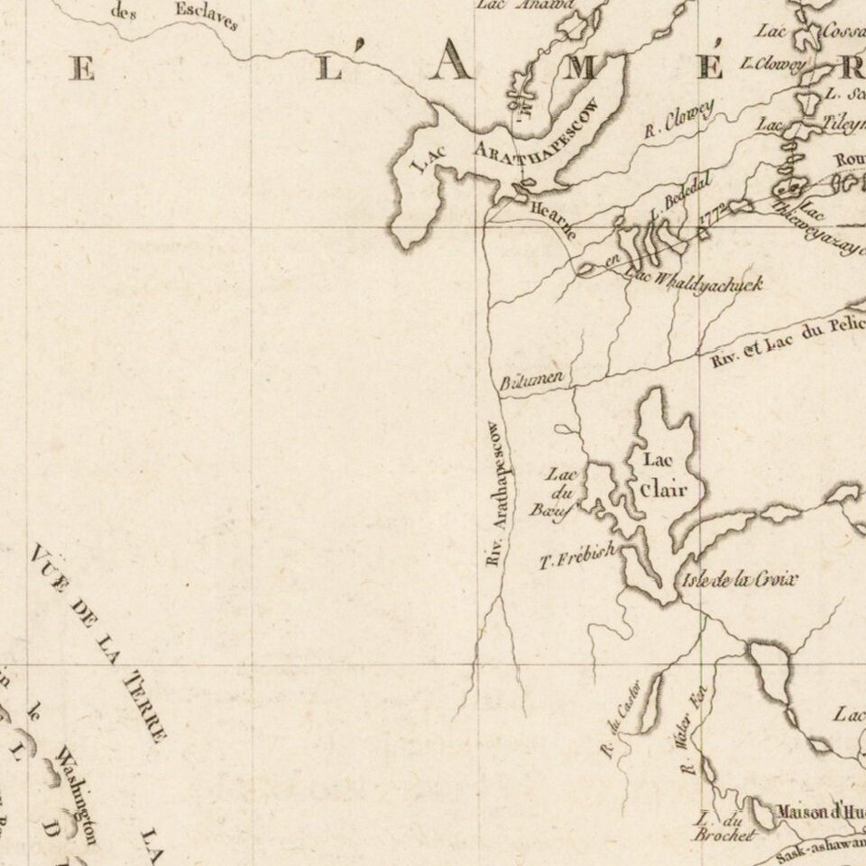 The focal point of the water course across North America Lac des Esclaves (Slave Lake), with the Riviere des Esclaves flowing east to Hudson Bay and a speculative river flowing west to the Cook Strait and Prince William Sound.