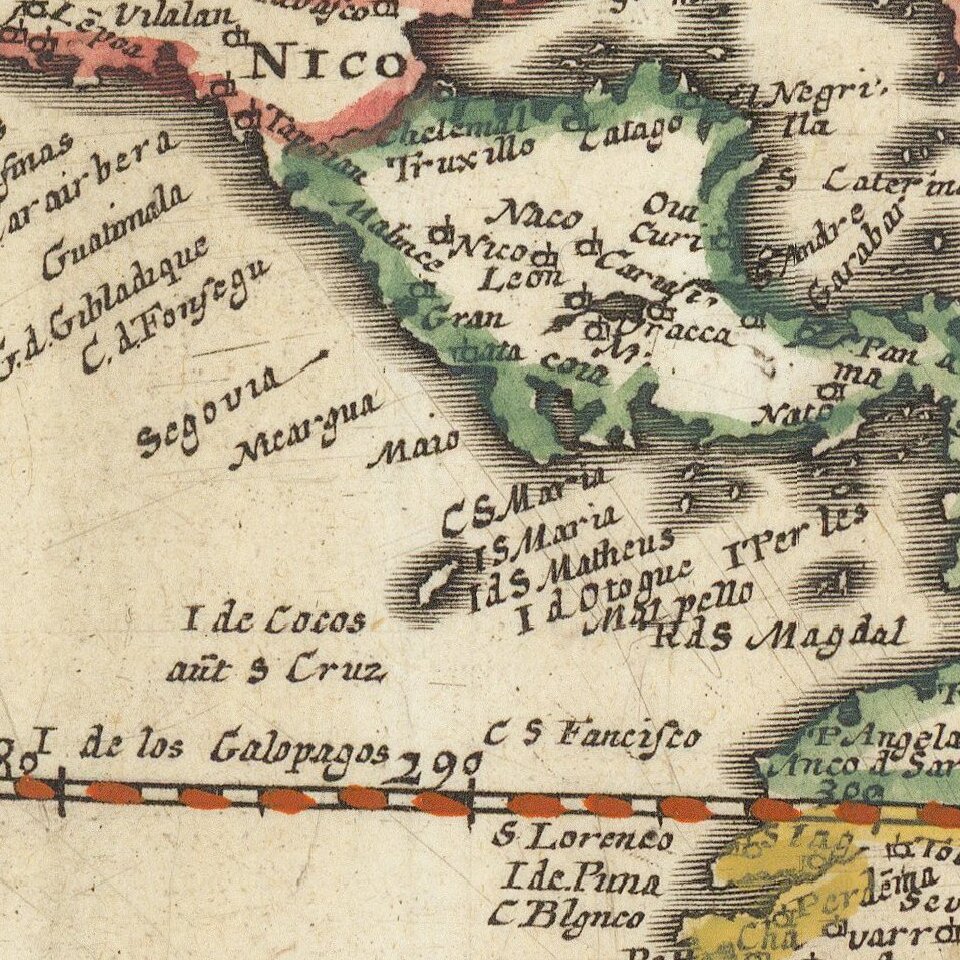 The map is a reduced edition of the Bertius/ Tavnernier Map of 1627, without embellishments. A definite northwest coast of America is shown, unlike the Hondius derivative of the map. A highly detailed and interesting 17th Century map of America, retaining much of the interesting early colonial details of the earliest French, Dutch, Spanish and English discoveries. No Great Lakes.