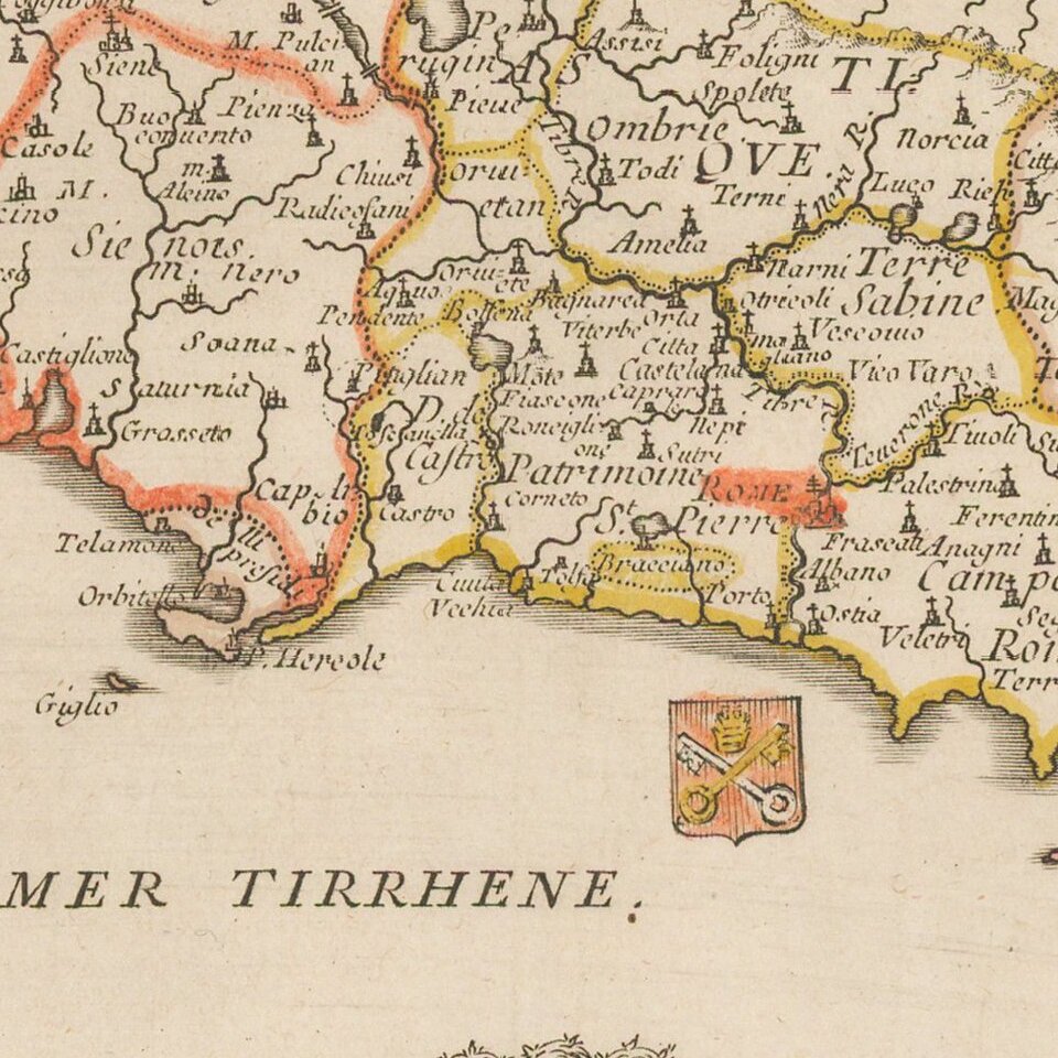 The map is embellished by approximately 20 coats of arms of the various regions of Italy.