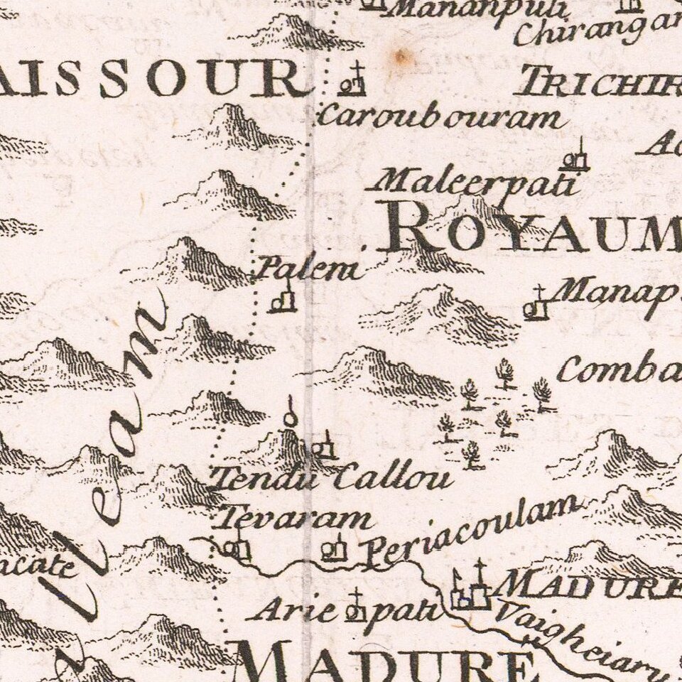 Nice copper engraved map of the tip of India and northern part of Sri Lanka showing the Jesuit missions.