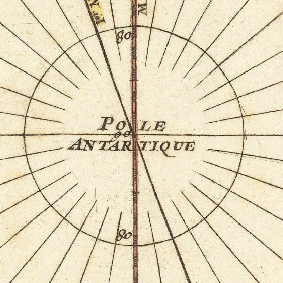 Buache would later go on to hypothesize that the southern pole must contain a frozen sea, fed by mountain ranges and huge rivers, in order to produce icebergs of the size reported by Bouvet; the large sea (Mer Glacial, 'Glacial Sea'). The image depicted on this first state of his map provides an early version of this hypothesis.