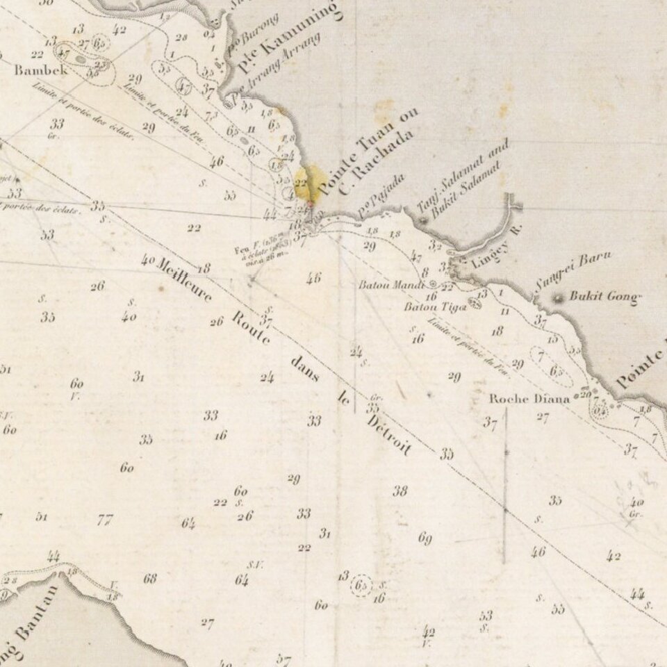 The French, who had increasingly consequential interests in Indochina, made heavy use of the Straits of Malacca. The French Dépôt de la Marine published a chart closely based on the Admiralty charts, Carte du Détroit de Malacca. Partie méridionale comprenant depuis le Mont Parcelar jusqu à Singapoure (1843). The present chart is a revised and improved edition of this chart, issued by the Dépôt in 1862. This series of charts of the straits would not be superseded until the publication of James Imray's Straits of Malacca, Singapore, Rhio & c. (1882).