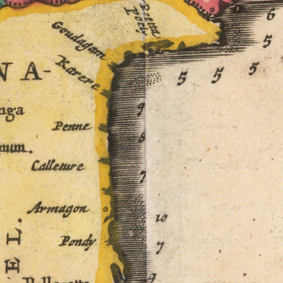 Detailed map of the southern part of India, Sri Lanka and the Maldives, published by Vander Aa in Leiden.